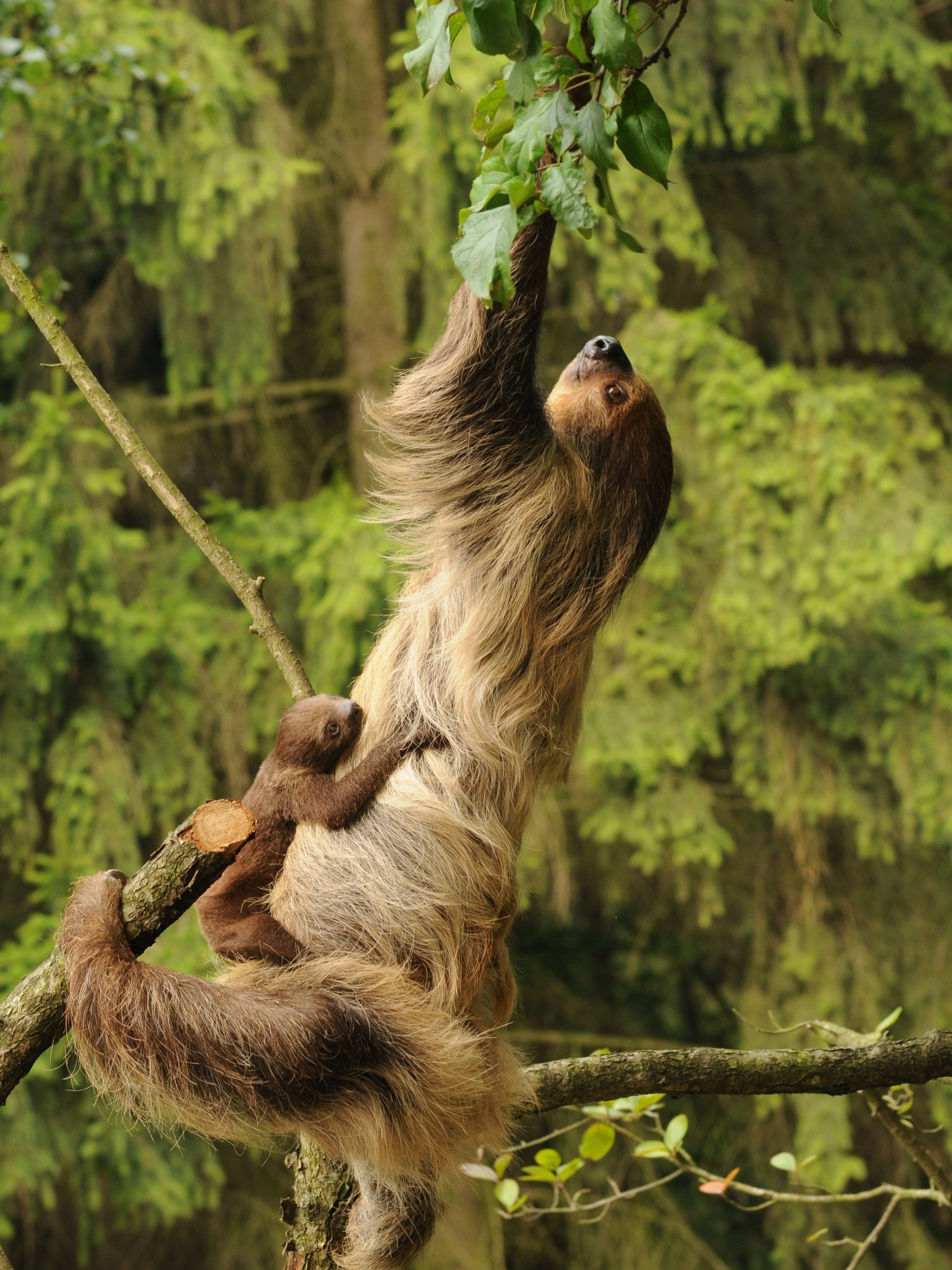 Samice je březí 150 - 180 dnů, rodí 1 mládě, které váží 300 - 400 g. Nosí je na hrudi půl roku.