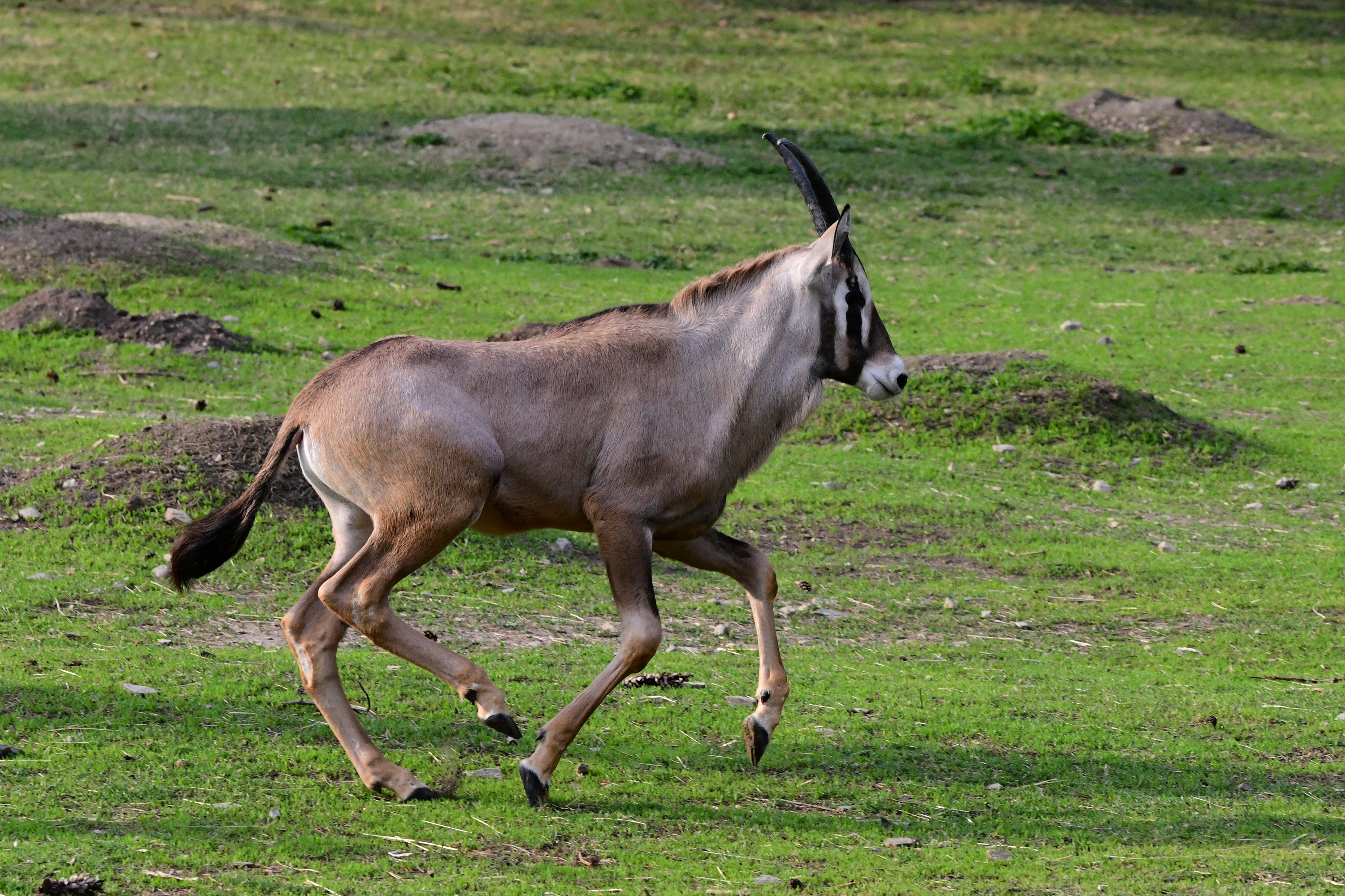 Tento poddruh africké pouštní antilopy zdobí jedinečná černobílá kresba, stejně jako typický úhoří pruh na zádech. Dlouhé rohy vzhled umocňují. Jejich skupiny čítají přibližně 15 členů, někdy se však stáda při svých dlouhých cestách za vodou a potravou setkají a dále pokračují v počtu až 200 jedinců. Ve skupině panuje přísná hierarchie. Výsostní postavení je dáno dominantnímu samci, mezi samicemi probíhají po vypuštění do výběhu vzájemné ritualizované souboje, které vedou k seřazení do hierarchického žebříčku. Oryxové se projevují tzv. distančním chováním, kterým si jednotlivá zvířata udržují od sebe vzájemný odstup. Porušují jej pouze v případě souboje, páření, či ve vztahu matka-mládě.